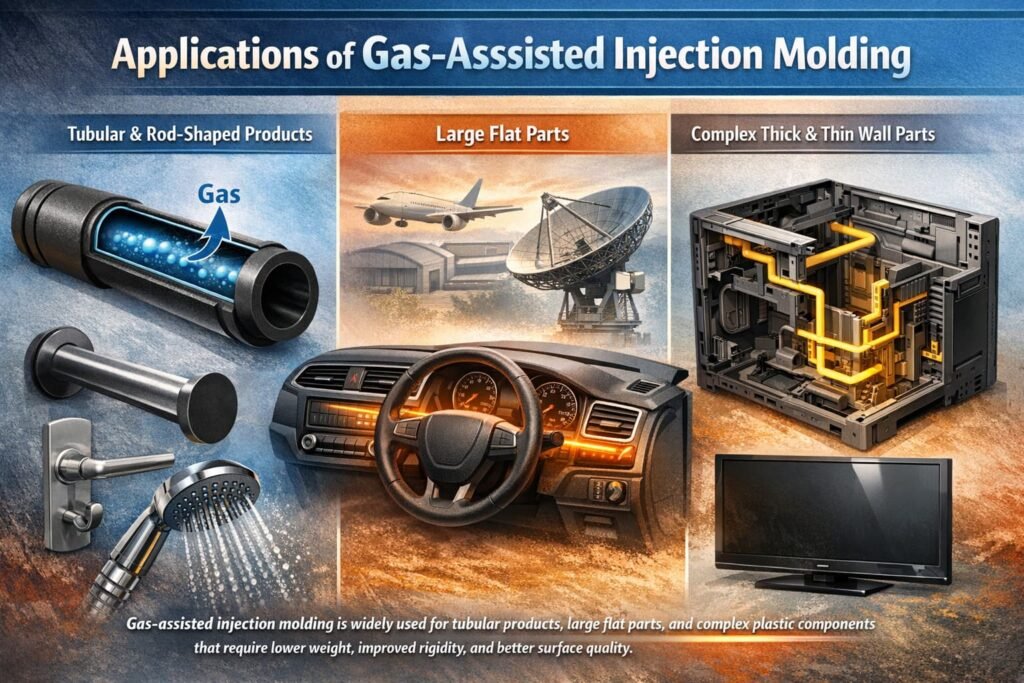 Large flat plastic components are another ideal application for gas-assisted molding. Examples include automotive dashboards, interior trim grilles, aircraft interior components, and similar large-area structural parts.