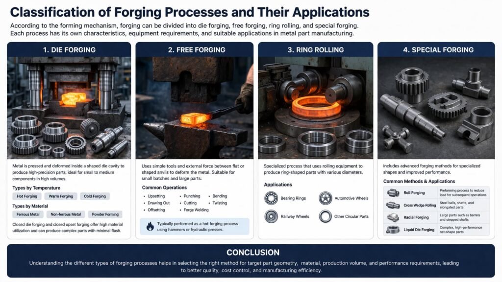 According to the forming mechanism, forging can be divided into die forging, free forging, ring rolling, and special forging. Each process has its own characteristics, equipment requirements, and suitable applications in metal part manufacturing.