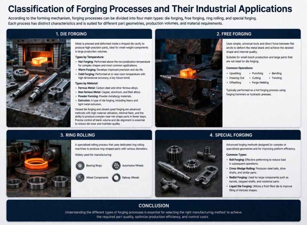 According to the forming mechanism, forging processes can be divided into die forging, free forging, ring rolling, and special forging. Each process has different forming characteristics and is suitable for different part structures, production volumes, and material requirements.