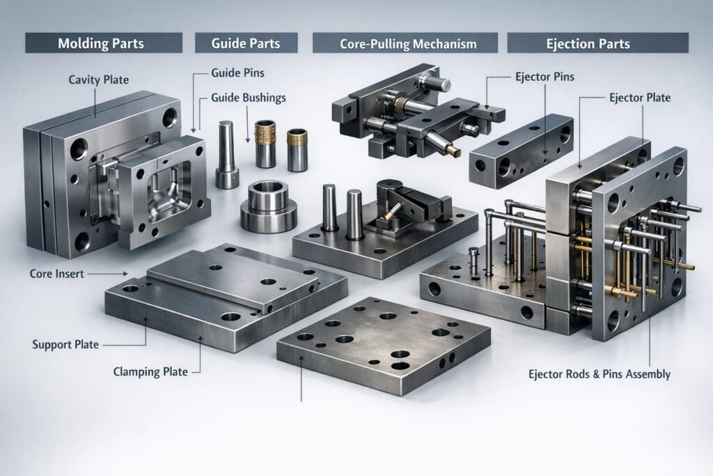 A mold is made up of several functional groups of parts, each serving a specific purpose during molding and demolding.