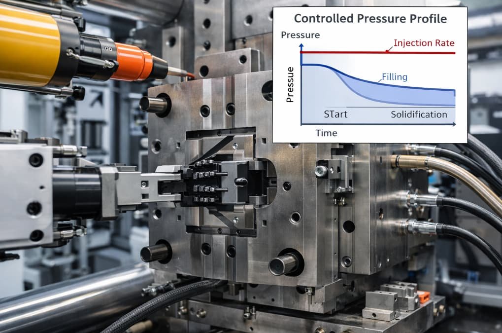 This controlled filling behavior helps minimize internal stress within the plastic part. High-speed filling at the beginning of the cycle also generates shear heat, which raises the melt temperature and lowers the melt viscosity. As a result, the material can fill the cavity more effectively even under lower pressure conditions.