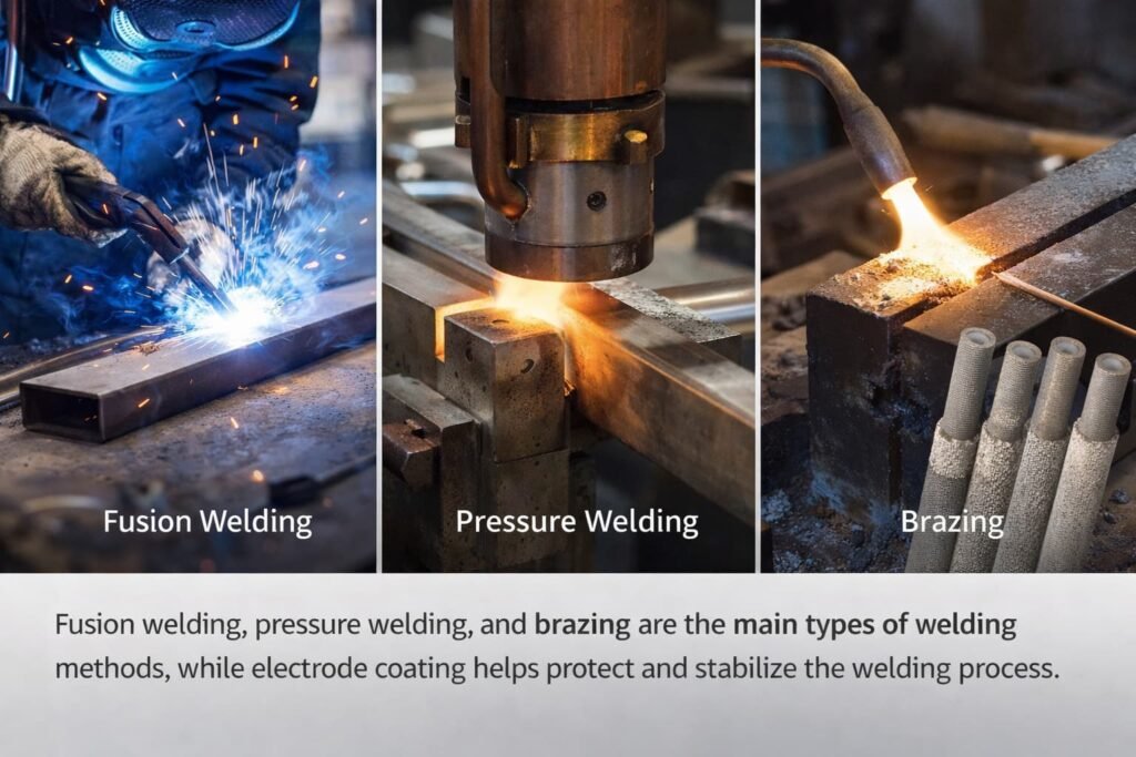 Fusion welding, pressure welding, and brazing are three fundamental welding methods used in industrial manufacturing. In arc welding applications, electrode coating also plays an important role in weld protection, metallurgical control, and welding performance, making it an essential part of stable and reliable welding operations.