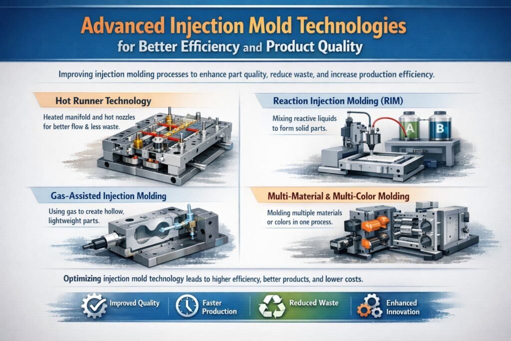 Modern injection mold manufacturing continues to develop through advanced molding technologies that improve part quality, production efficiency, material utilization, and design flexibility. Among the most widely used advanced injection mold technologies are hot runner systems, reaction injection molding, gas-assisted injection molding, and multi-material injection molding.