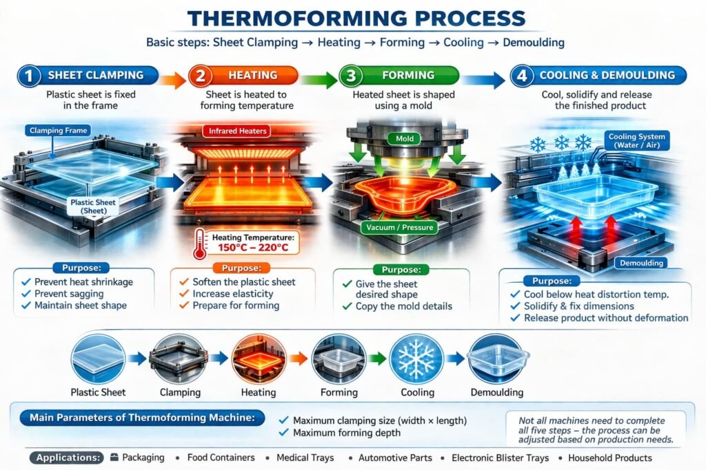 Thermoforming Process Steps: Clamping, Heating, Forming, Cooling and Demoulding
